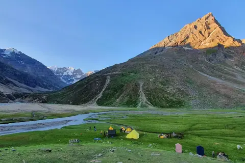 Trek from Denora Camp to Kalapari Camp 03 km) (2/3 hours) 12875 ft) overnight stay Camp.Trek from Denora Camp to Kalapari Camp covering 3 km in about 2-3 hours.Start from Denora Camp, enjoying the peaceful surroundings before beginning the trek.The trail involves a gradual ascent through scenic meadows, rocky paths, and small streams.Experience breathtaking views of the Warwan Valley and surrounding Himalayan peaks.Reach Kalapari Camp at 12,875 ft, a serene campsite with mesmerizing mountain vistas.A relatively easy trek compared to the previous day, allowing time for relaxation.Ideal spot to acclimatize further to the altitude and prepare for the next trekking days.Stay hydrated and maintain a steady pace to adjust to the high-altitude environment.Overnight stay at Kalapari Camp, soaking in the tranquility of the Himalayan wilderness.
